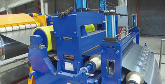 設(shè)備在工作時(shí)送料機(jī)構(gòu)處于被動(dòng)送料狀態(tài),板料通過夾送并經(jīng)板頭液壓剪床剪去不規(guī)則料頭后經(jīng)側(cè)向引導(dǎo)機(jī)構(gòu)進(jìn)入圓盤剪切機(jī)剪切成客戶需要的帶狀條料??v剪過程中,通過廢邊卷取機(jī)對(duì)縱切下來的廢邊迅速進(jìn)行收取成卷狀。縱切下來的帶料,通過活套緩沖,并經(jīng)過兩組分離裝置進(jìn)入張力站,通過該張力裝置和卷取機(jī)建立所需的收卷張力,以防止卷取后塌卷。最后由卸料機(jī)構(gòu)把料卷從收料軸上卸到出料小車后運(yùn)出。