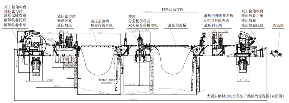 收紙機(jī)一雙工位儲(chǔ)料臺(tái)一上料小車(chē)一液壓放卷機(jī)一液壓托臂一接料引頭、鏟頭、二輥夾送+三輥整平、液壓料頭剪一覆膜一活套(前渡橋)一糾偏一壓料一縱剪一廢絲收卷一活套(后渡橋)一預(yù)分料、張力機(jī)一收卷一下料小車(chē)—液壓控制—電氣控制;