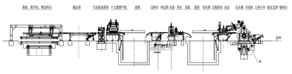 本設(shè)備的工作流程:本設(shè)備是將鋼板(各種金屬材料卷)通過(guò)整平后、定尺橫剪的方式把鋼板加工成客戶需要尺寸的專用剪切設(shè)備。該生產(chǎn)線的主要設(shè)備由收紙機(jī)、液壓上料小車、開(kāi)卷機(jī)、接料鏟頭、整平主機(jī)、渡橋、NC定尺送料機(jī)、靜電覆紙機(jī)構(gòu)、高速剪床、集料等機(jī)構(gòu)構(gòu)成,中間輔以運(yùn)料、緩沖、引導(dǎo)、輸送、出料等裝置。