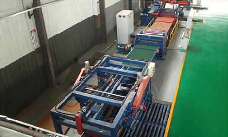 設(shè)備在工作時(shí)開卷機(jī)處于送料狀態(tài),板料進(jìn)入整平機(jī)校平后,再經(jīng)電眼控制活套、側(cè)向機(jī)構(gòu)進(jìn)入NC定尺裝置,NC定尺裝置按設(shè)定好的尺寸定尺向后工序剪床送料;當(dāng)NC送料達(dá)到設(shè)定尺寸時(shí),設(shè)備停止送料同時(shí)將信號傳給剪床,由剪床將板料切斷,切下的板料經(jīng)輸送裝置送入集料架整齊堆垛,堆垛鋼板的升降臺可隨堆垛鋼板高度的增加而自動下降;當(dāng)堆垛鋼板張數(shù)達(dá)觸摸屏設(shè)定值時(shí),生產(chǎn)線自動停機(jī),此時(shí)人工控制降下升降臺,將出料臺車開出,同時(shí)開進(jìn)另一臺出料臺車,即進(jìn)入下一工作循環(huán)。